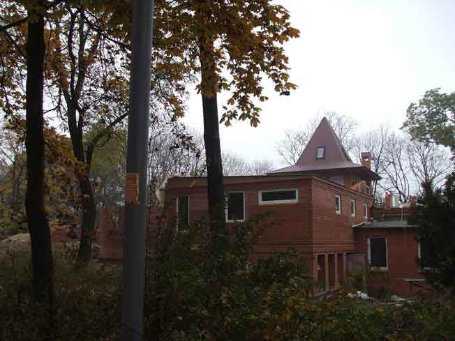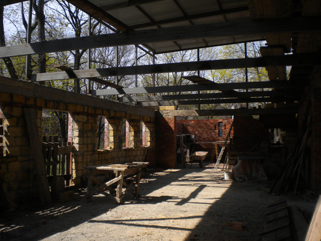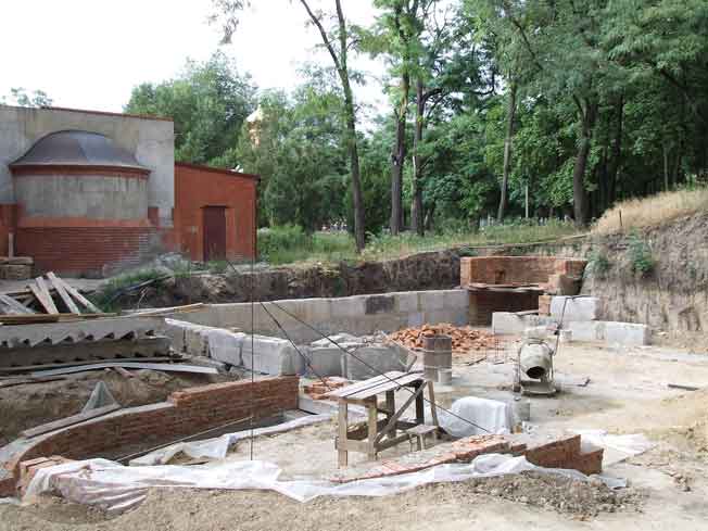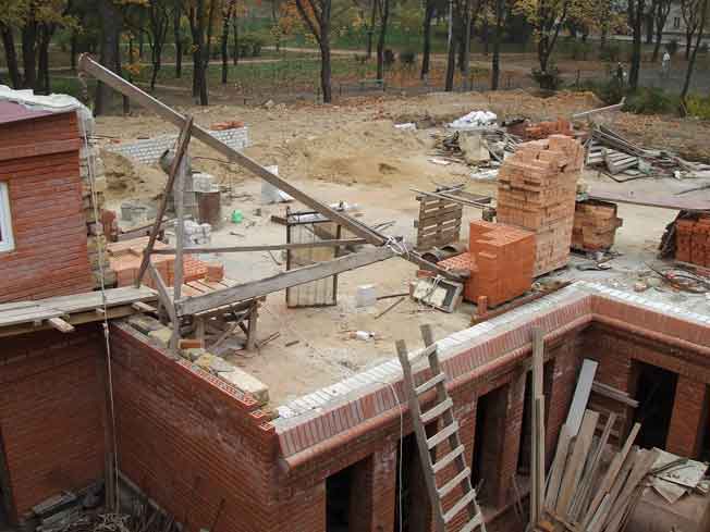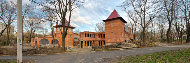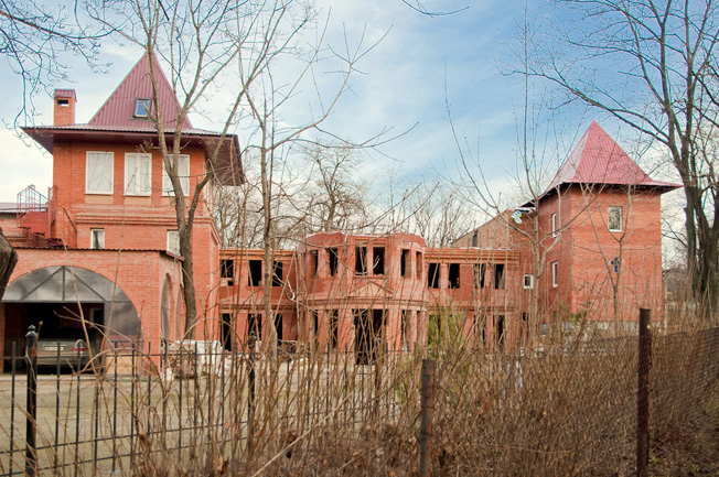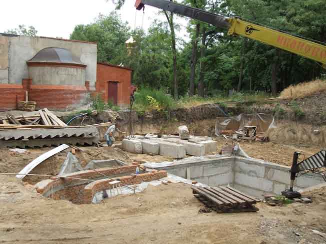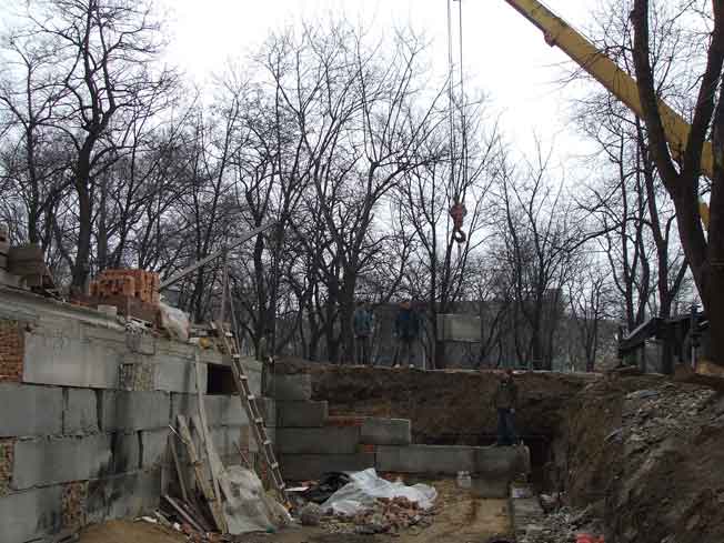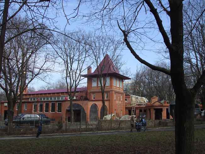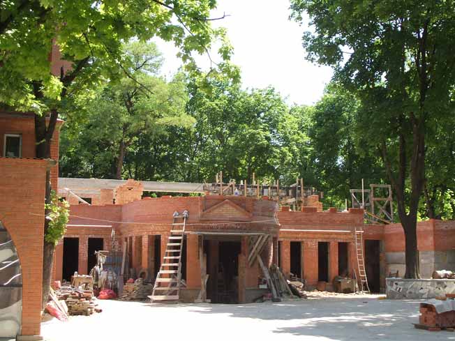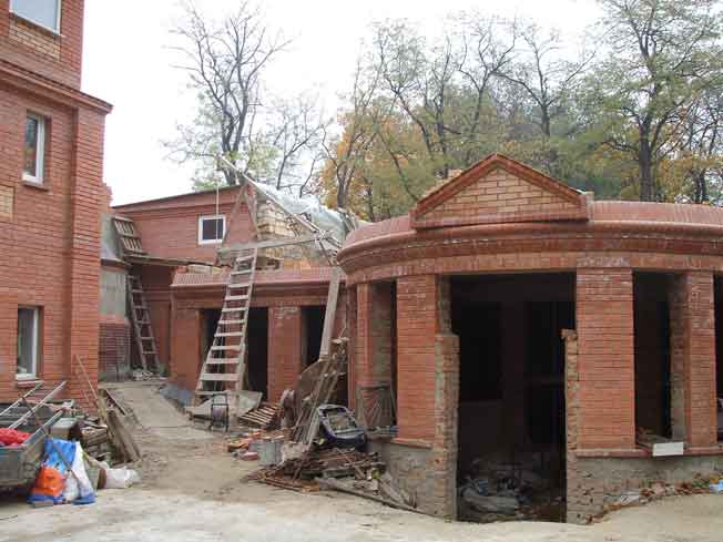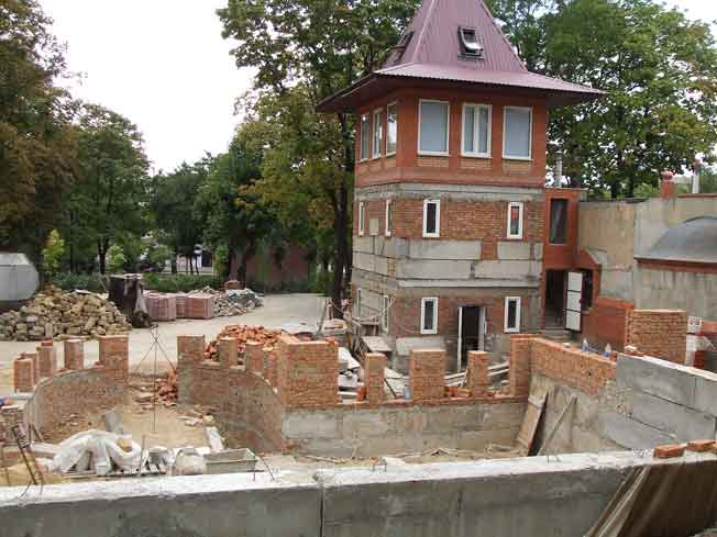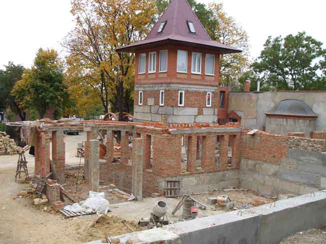 Общий вид строящегося комплекса. Видна новая крыша главного здания, которую пришлось надстроить над пришедшей в негодность старой деревянной. Снимок сделан 19 февраля 2009 года.