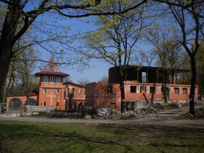 10.04.16. Вид на строящийся правый флигель с башней-котельной.